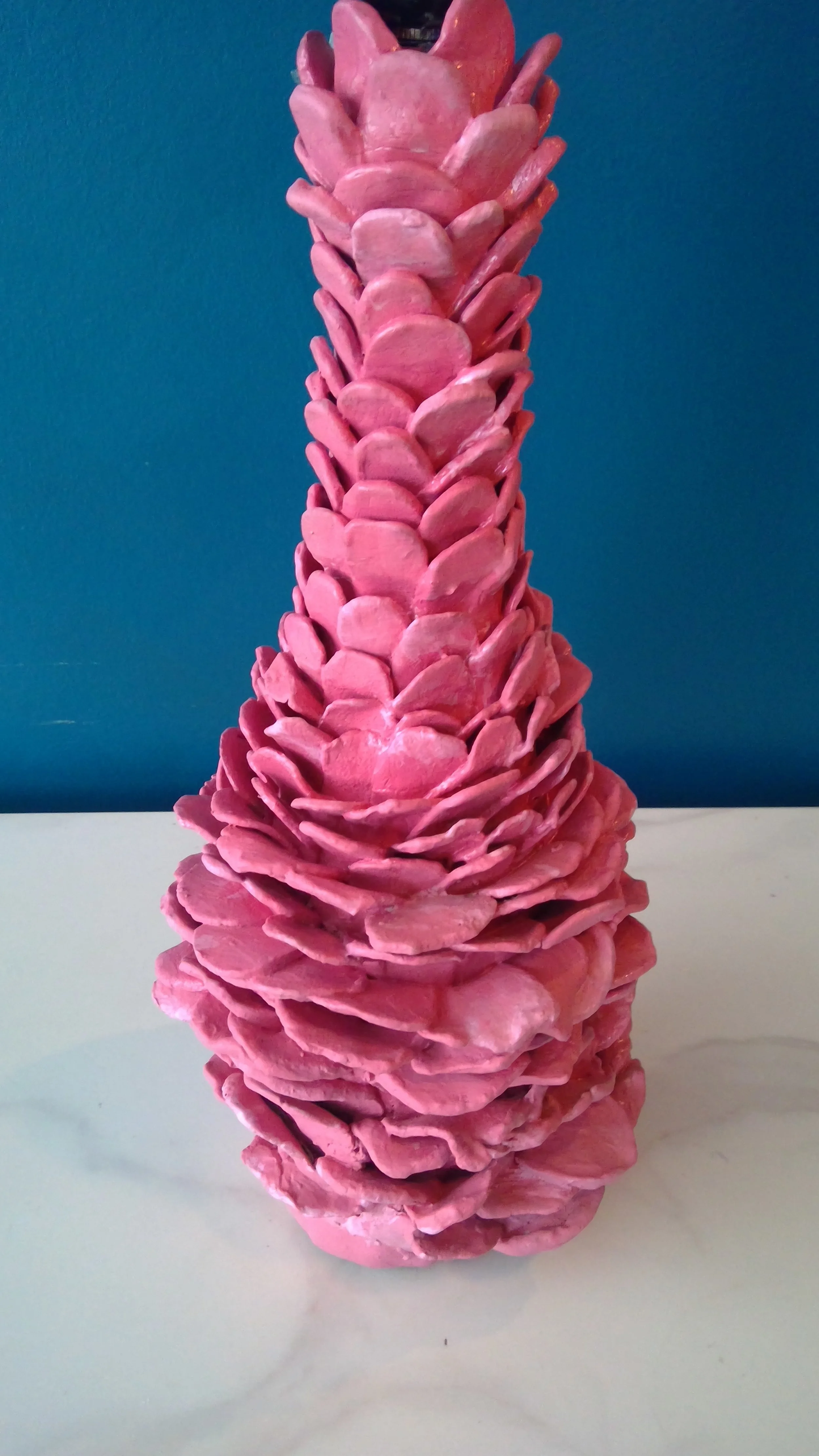 Ingredients: Empty Rosé bottle, Clay, ‘Little Greene’ emulsion paint ‘Carmine 189’, & resin gloss sealant.